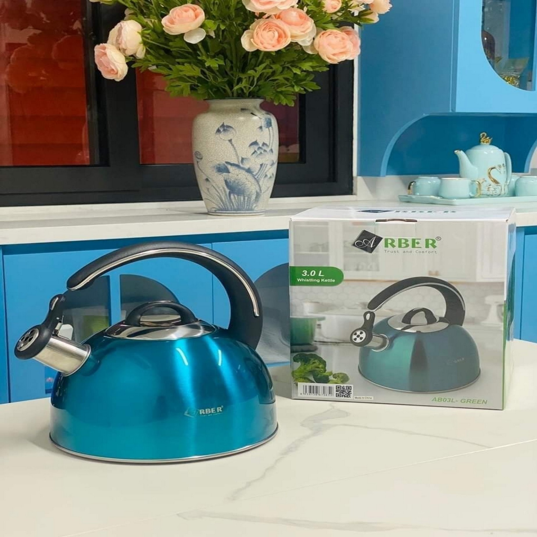 Sang trọng khi tiếp khách: ấm inox sáng bóng, vòi và nắp đẹp mắt, dễ dàng trưng bày trong bếp.