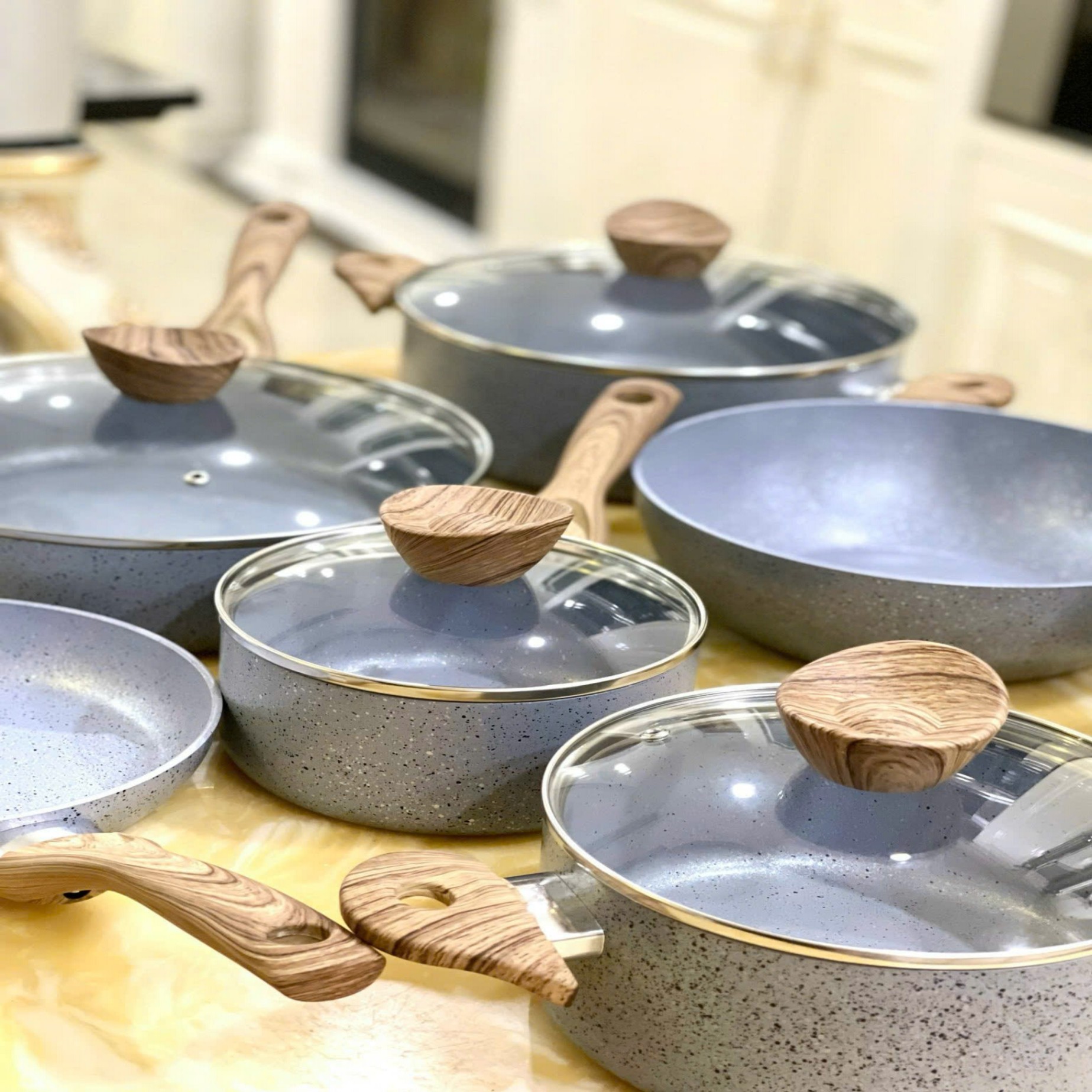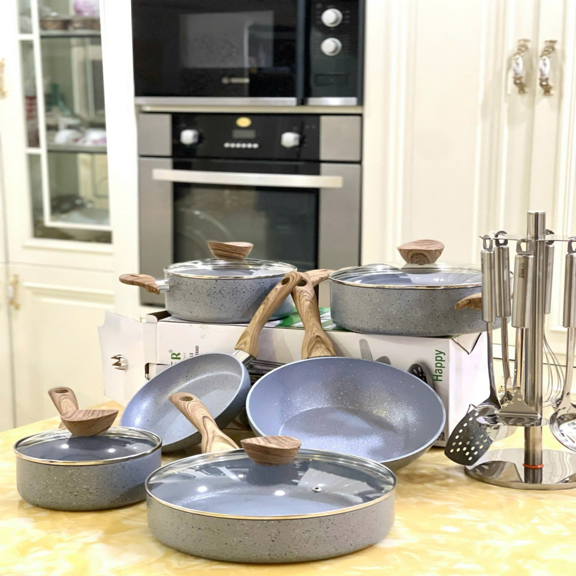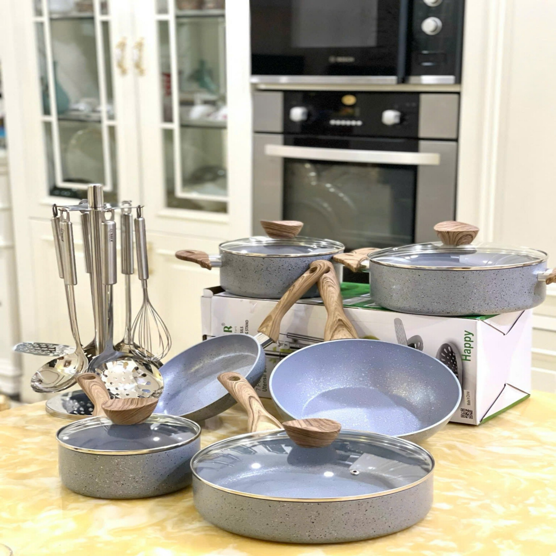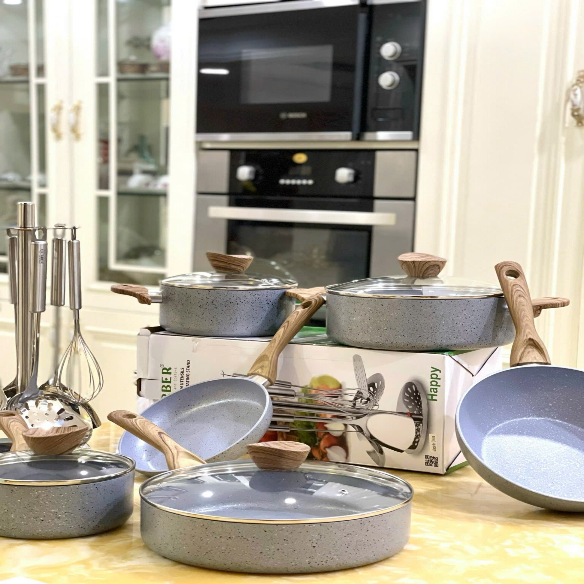 Xếp gọn, để nơi khô ráo, dùng miếng lót giữa các nồi/chảo để tránh trầy sơn hoặc inox.