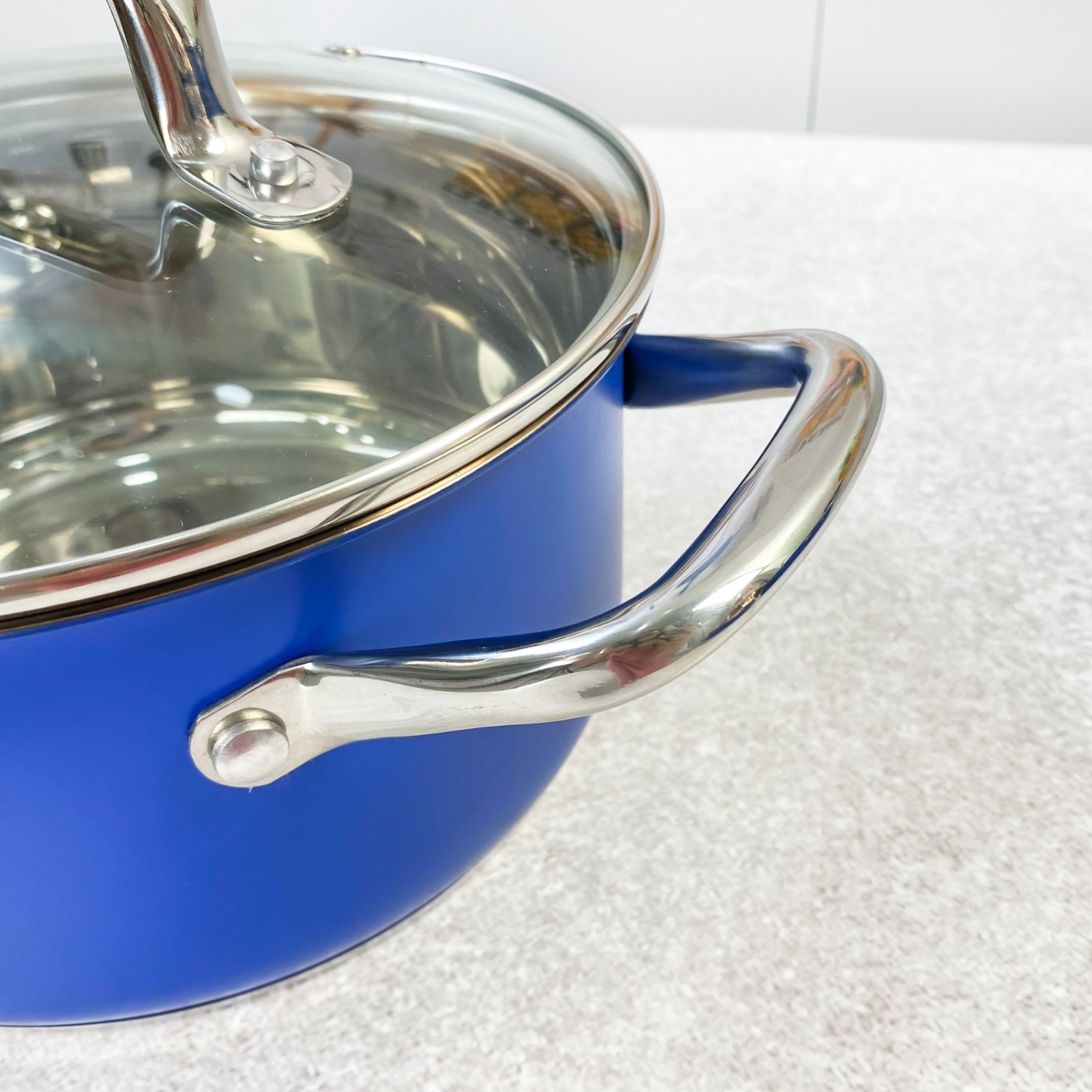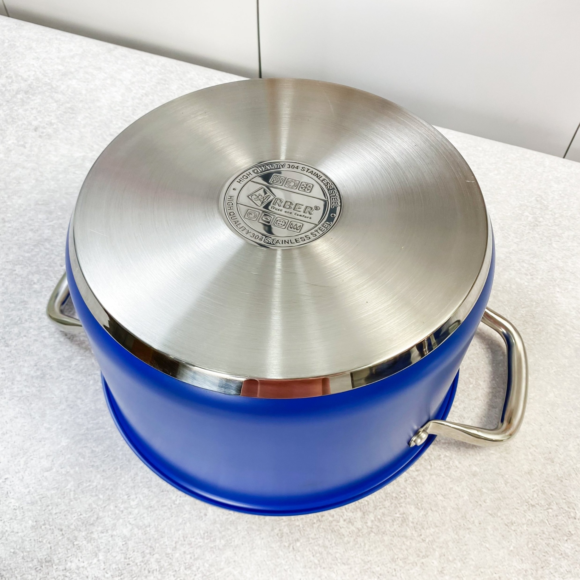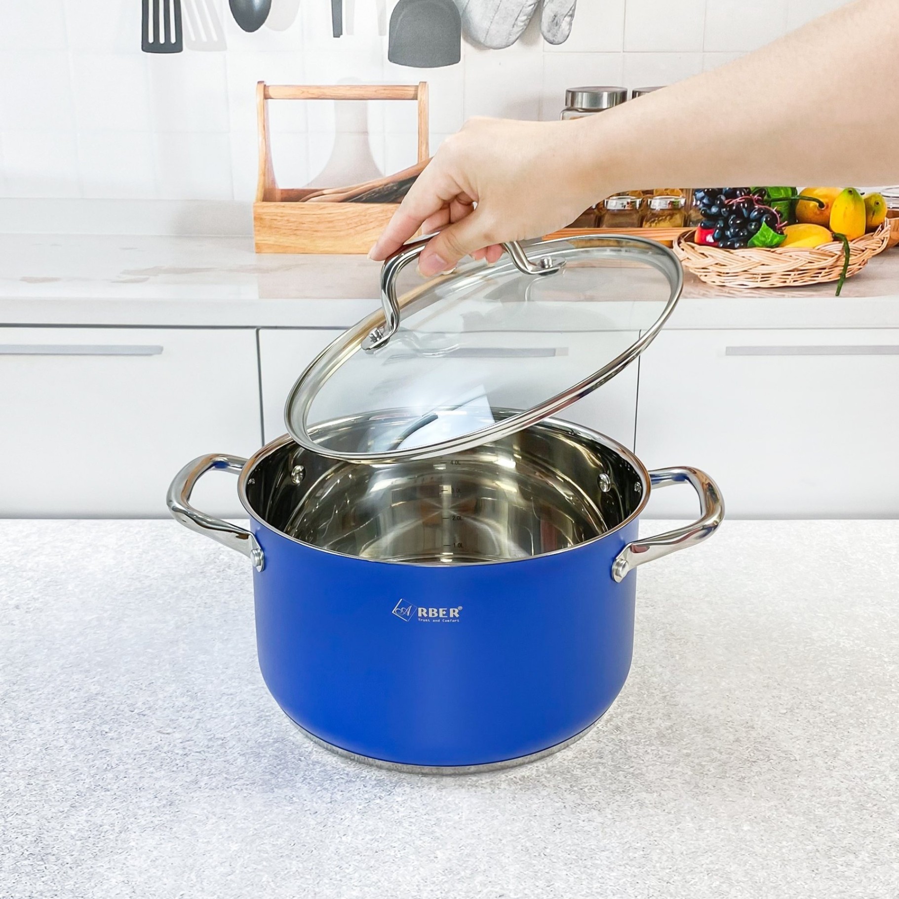 Thiết kế màu xanh navy hiện đại, thân nồi trơn bóng dễ vệ sinh; thân và tay cầm inox ít nóng, an toàn khi cầm