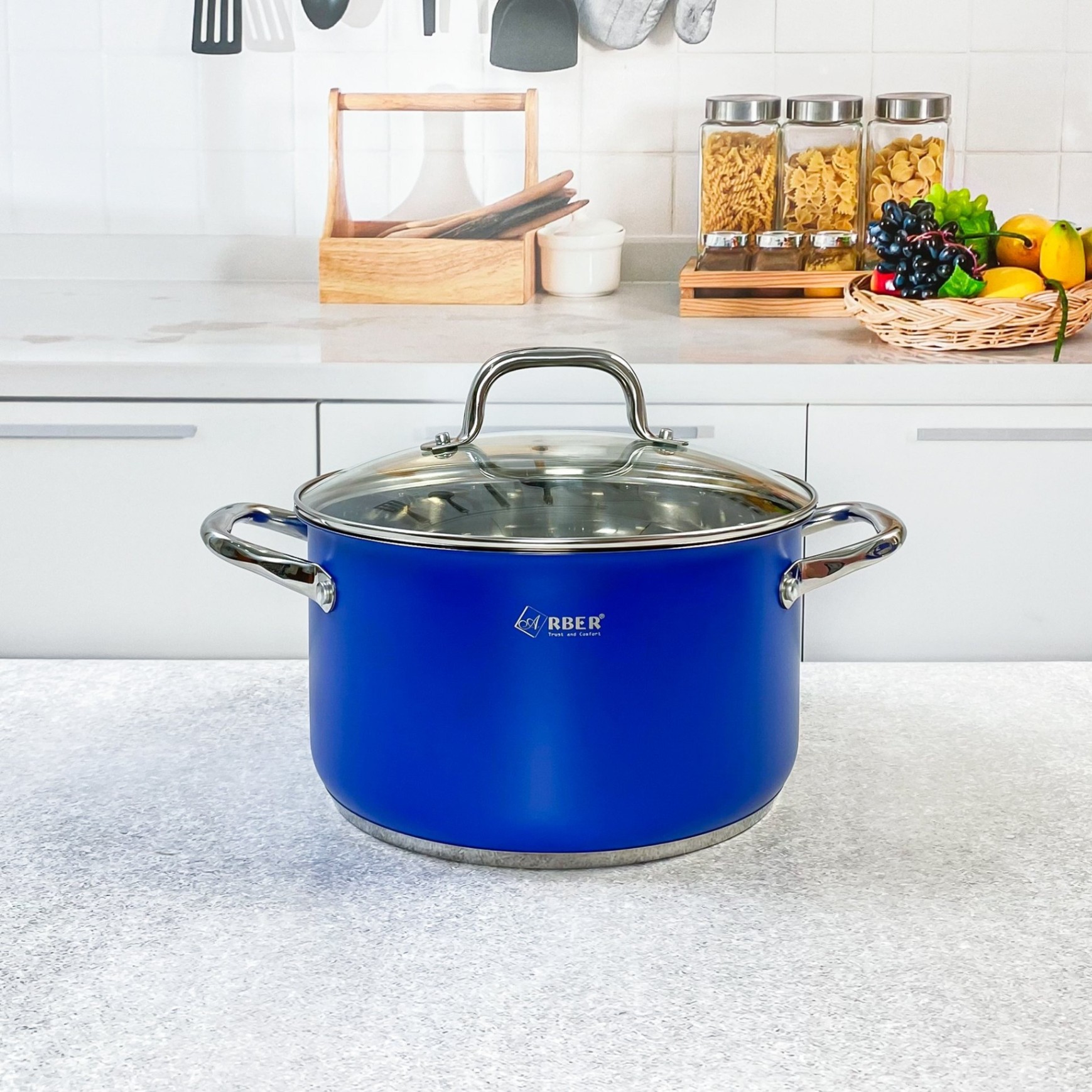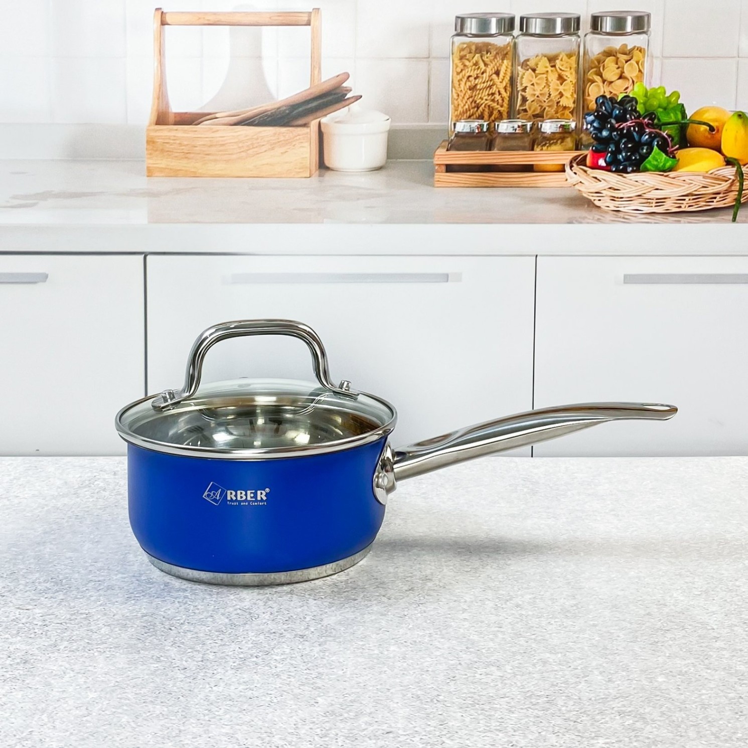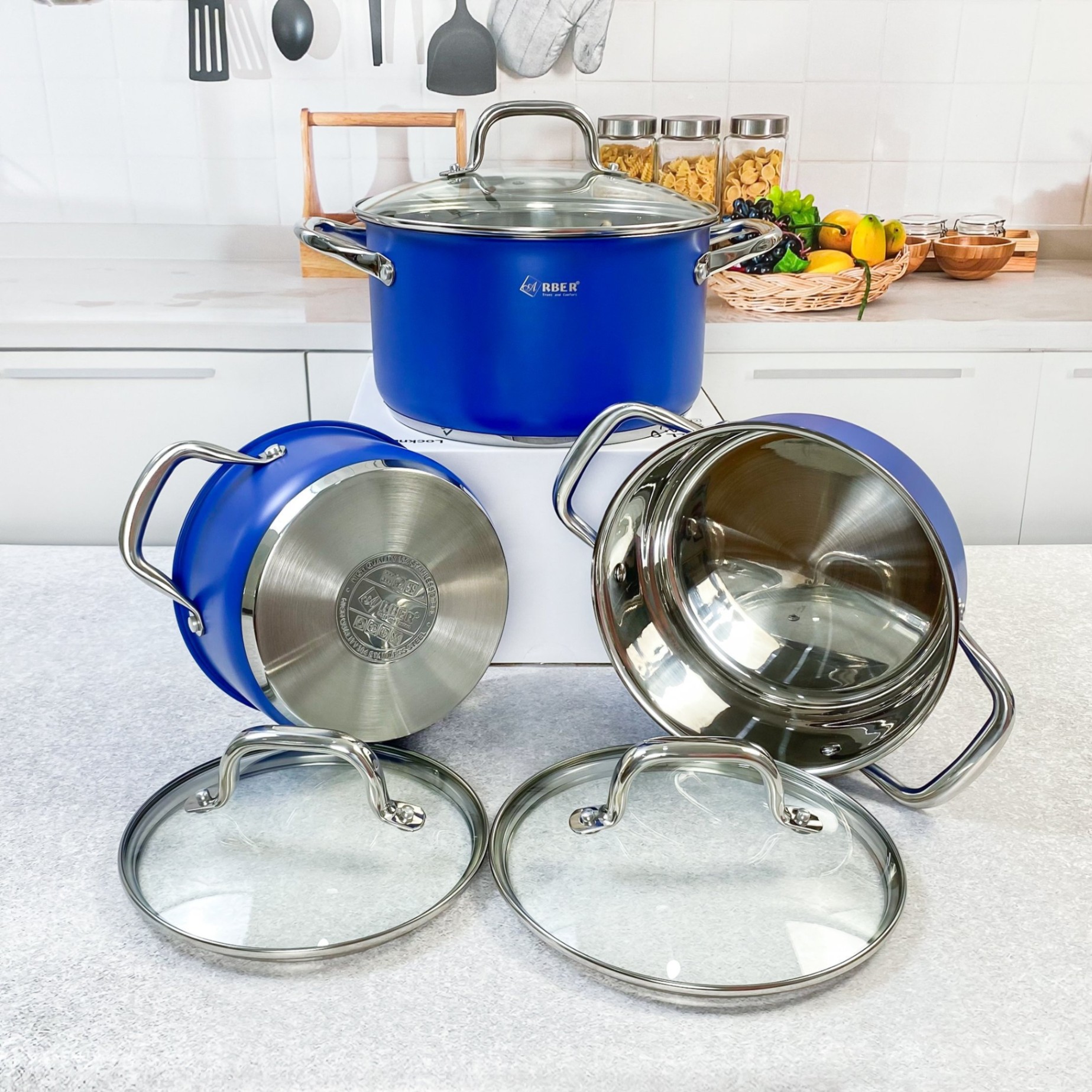 Thiết kế màu xanh navy hiện đại, thân nồi trơn bóng dễ vệ sinh; thân và tay cầm inox ít nóng, an toàn khi cầm