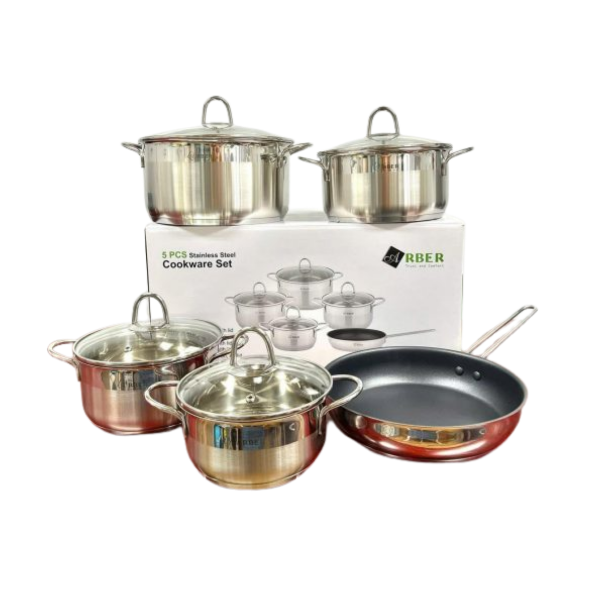 Bộ nồi từ chảo 5 chiếc cao cấp ARBER làm bằng chất liệu thép không gỉ, đáy bộ nồi 3 đáy siêu bền khi sử dụng, bộ nồi tiếp xúc nhiệt nhanh, êm, tản nhiệt đều khi nấu. Bộ nồi từ 5 chiếc cao cấp ARBER bán với giá tốt nhất trên thị trường. Bộ sản phẩm chuẩn