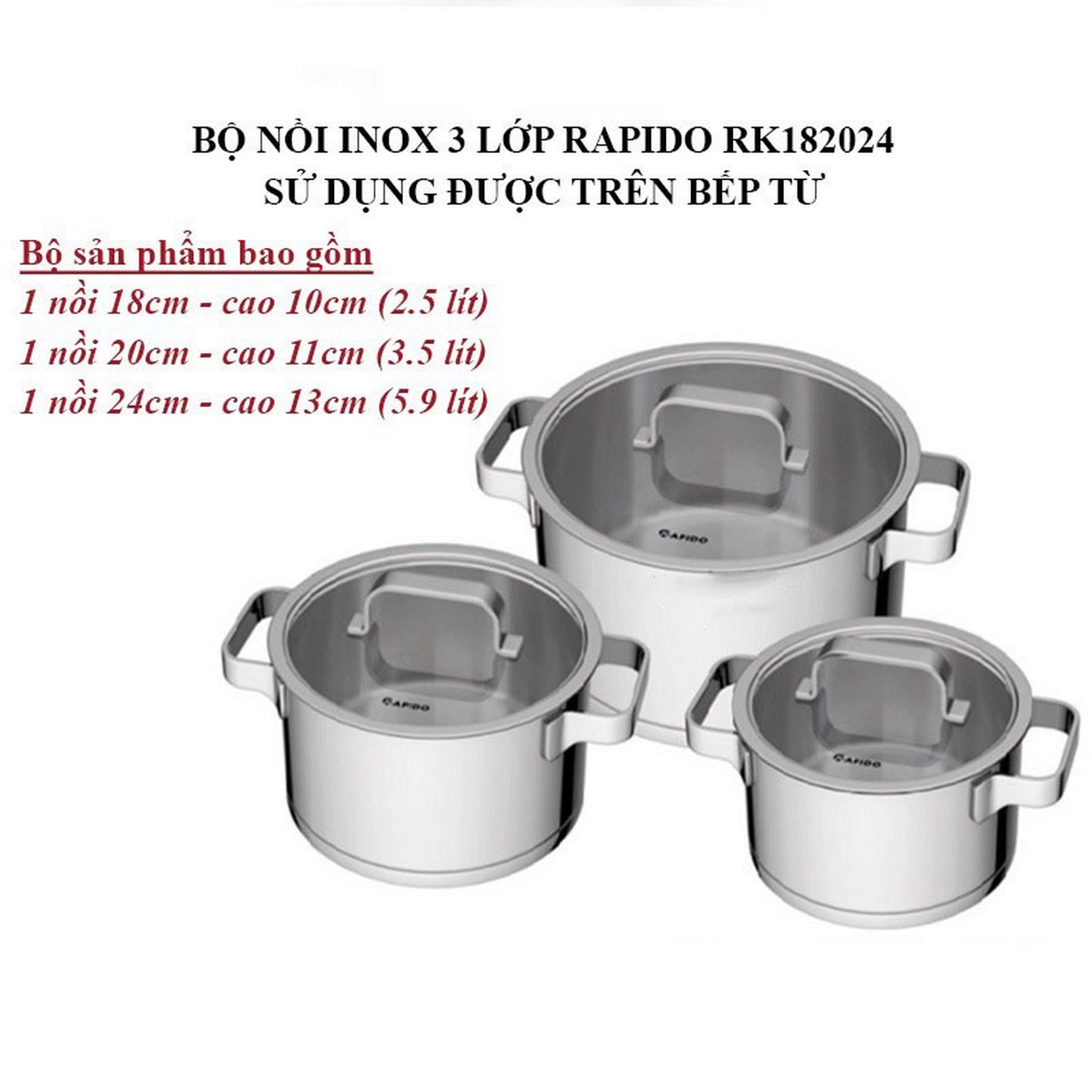 Bao gồm 3 nồi với kích thước:-
