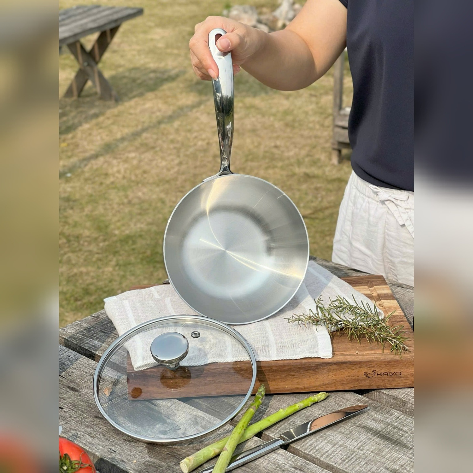 Xung quanh chảo không cần tay cầm phải chạm lửa — phần inox tiếp xúc chính sẽ chịu nhiệt tốt.
