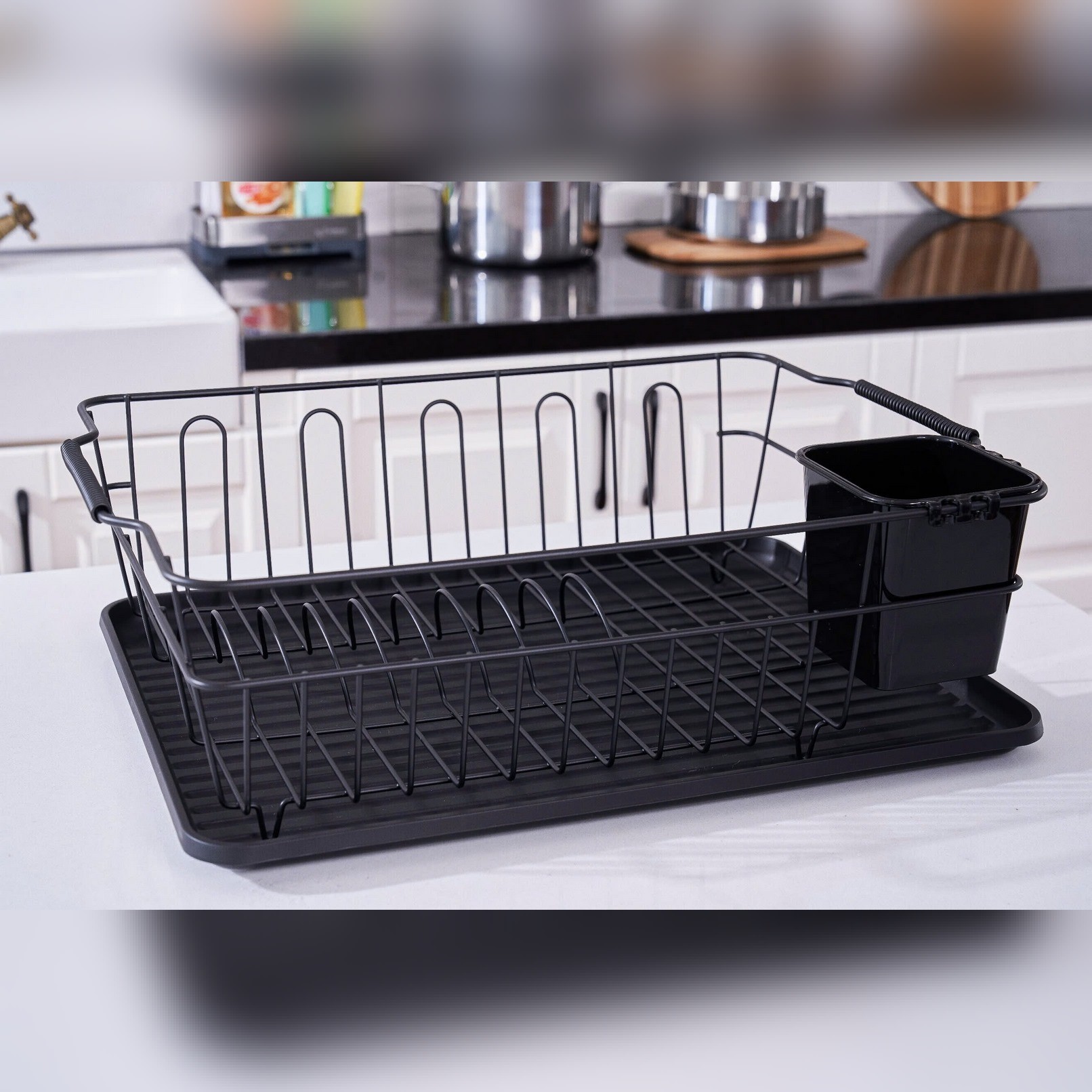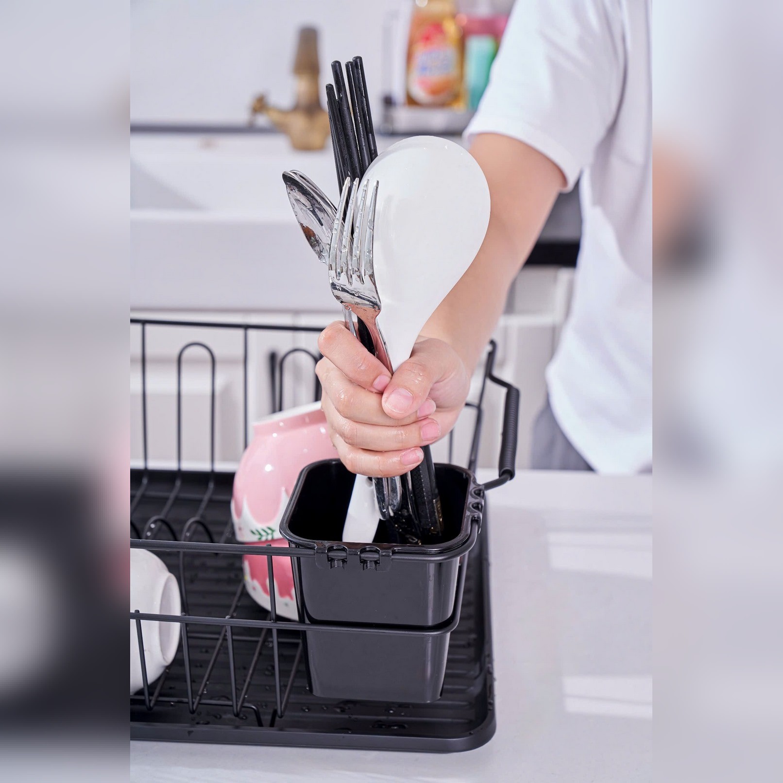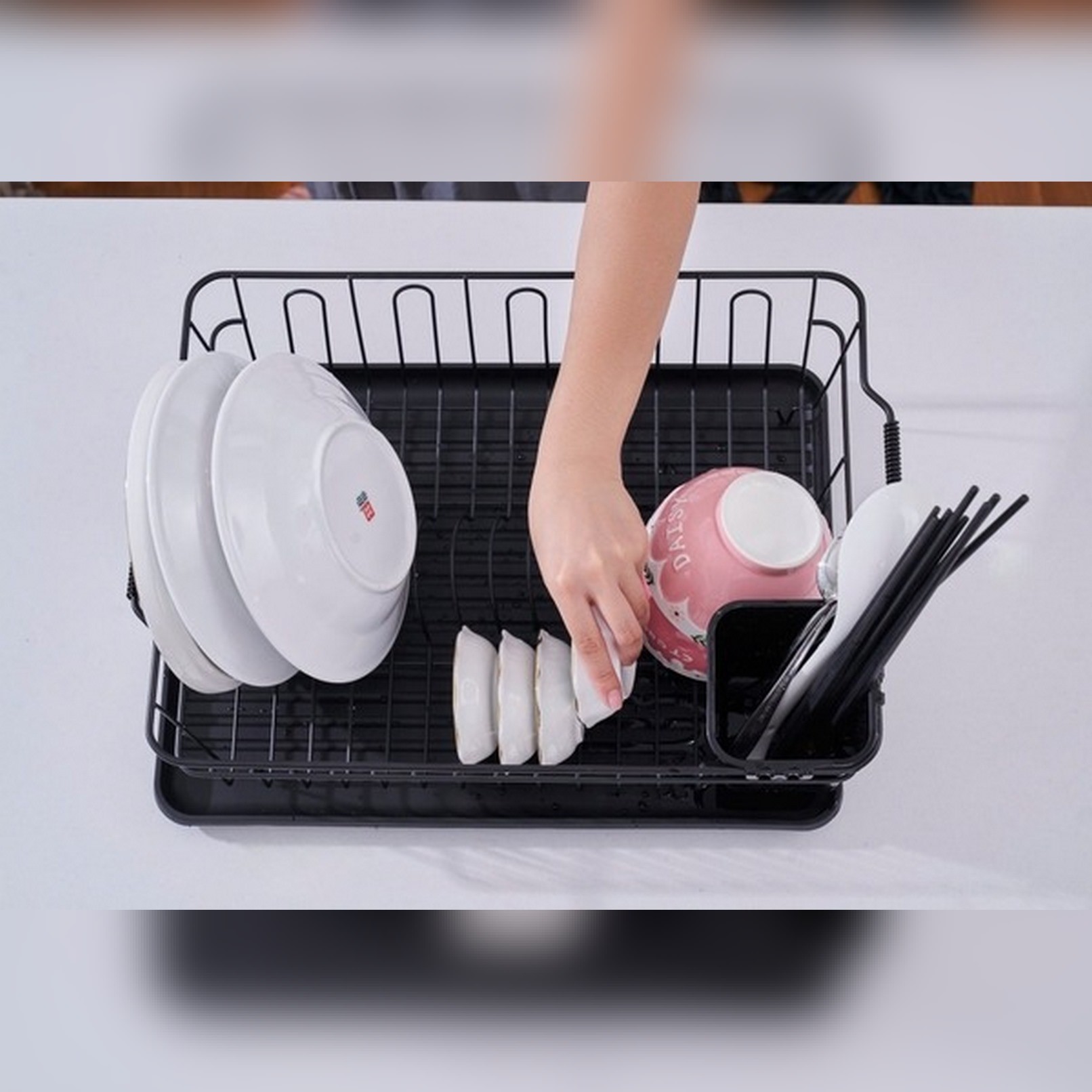 - Giá được thiết kế hình chữ nhật có thể úp được 6 bộ bát đĩa cho gia đình 6 người. Giá được làm bằng chất liệu thép carbon cùng khay hứng nước bằng nhựa giúp bàn bếp luôn khô ráo. Ngoài ra, giá có đi kèm 01 giá để thìa dĩa và 5 giá úp cốc vô cùng tiện lợi.