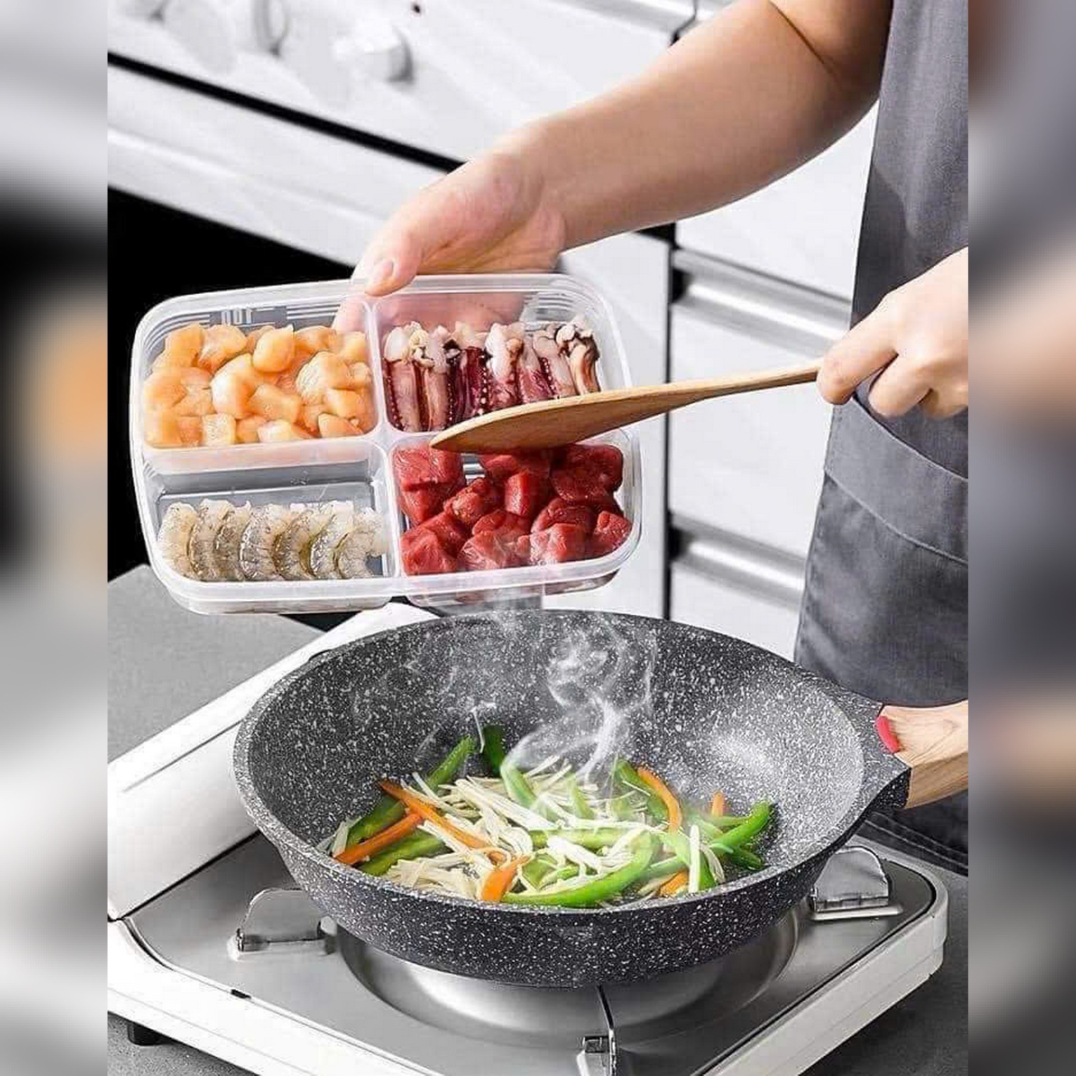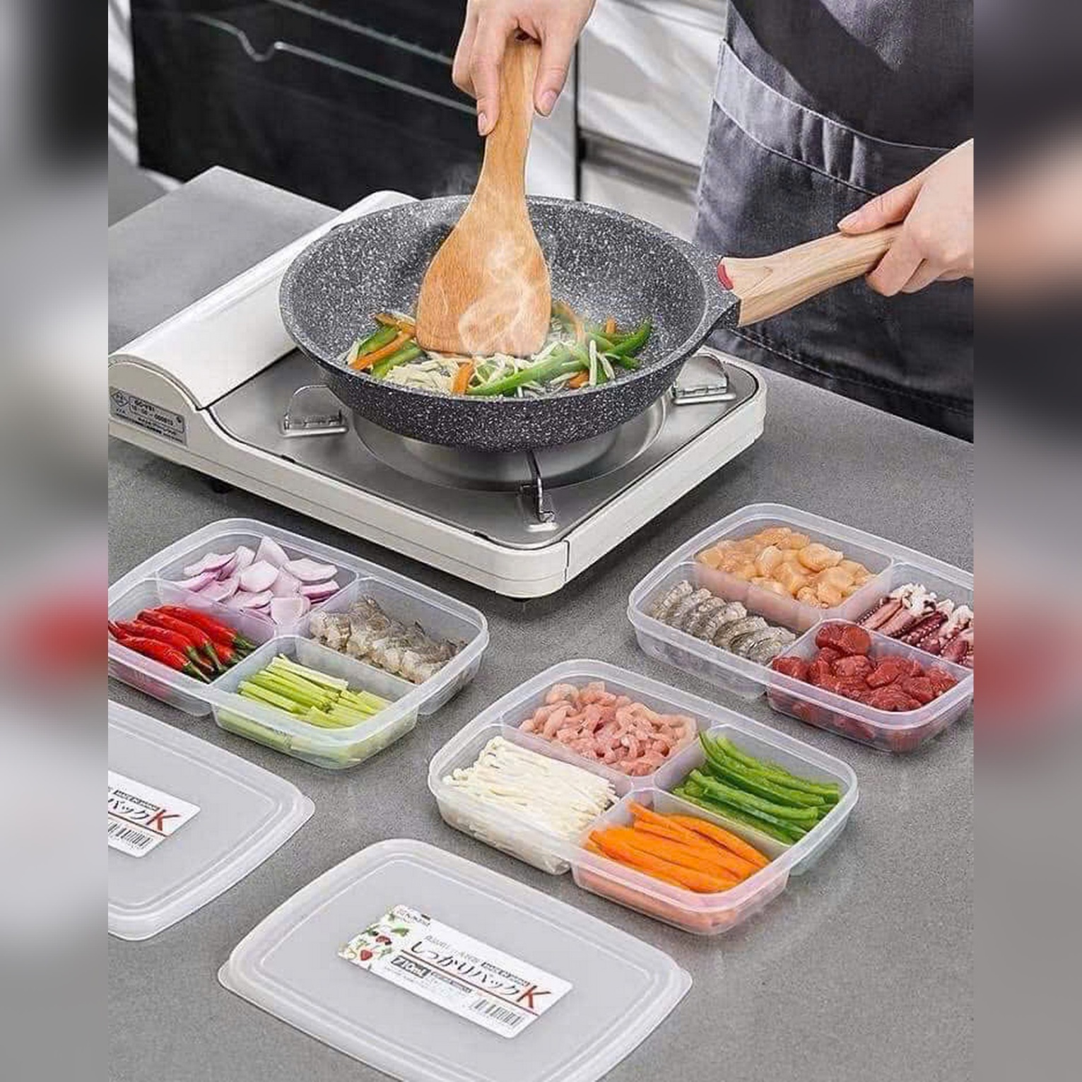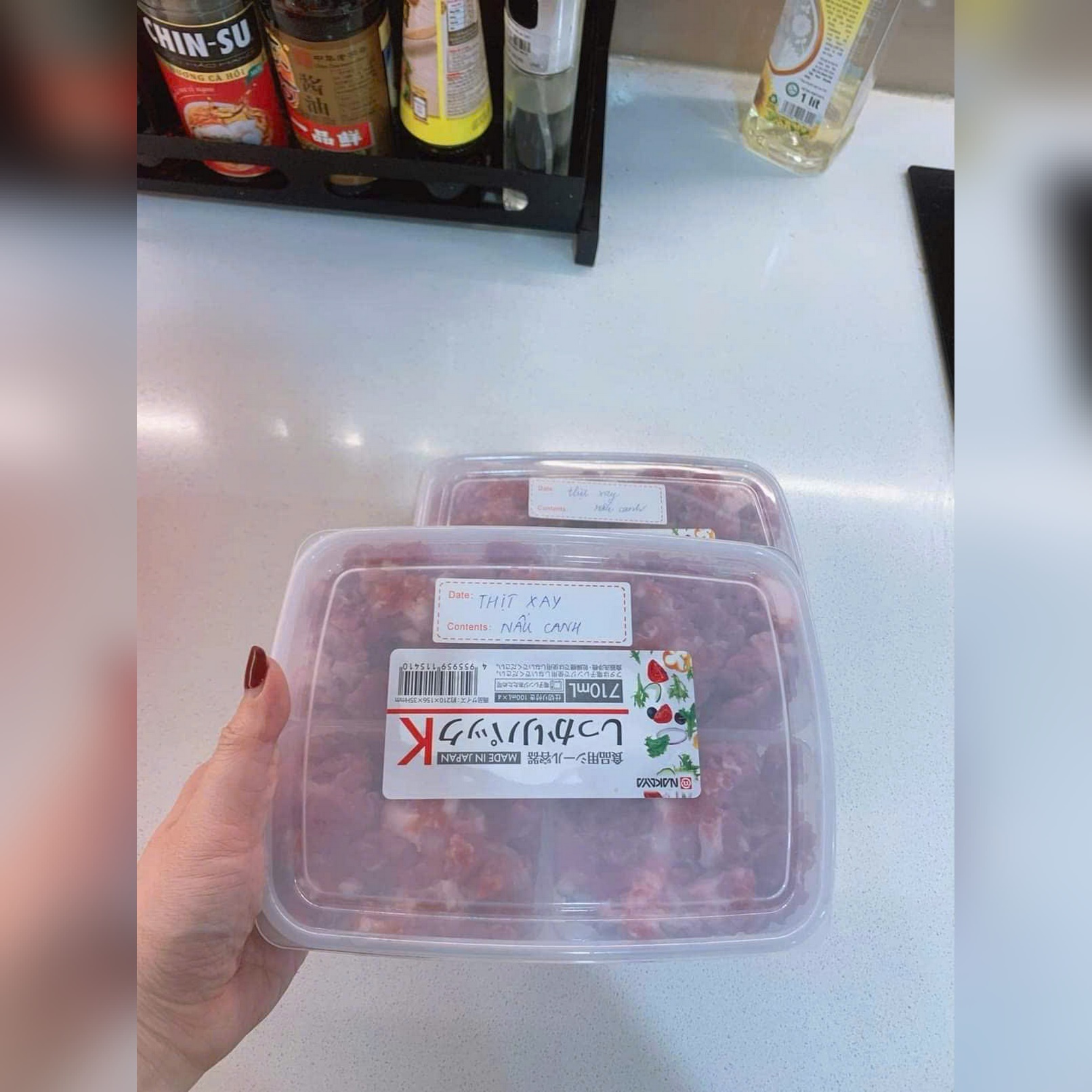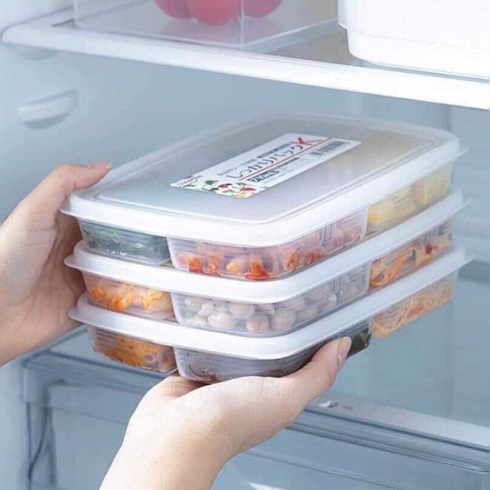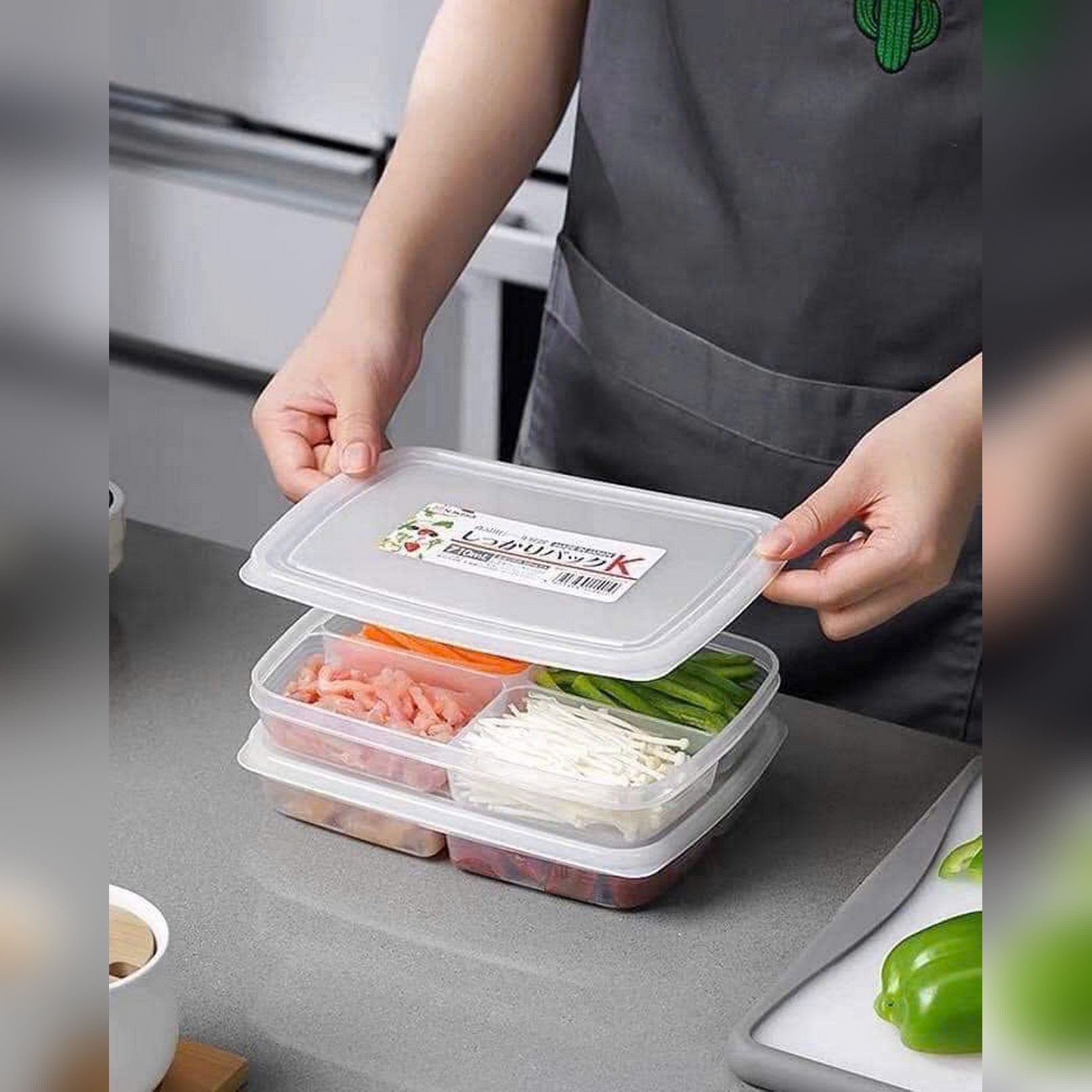 Đựng thức ăn vào các ngăn tương ứng, đóng chặt nắp – đảm bảo không tràn khi di chuyển.