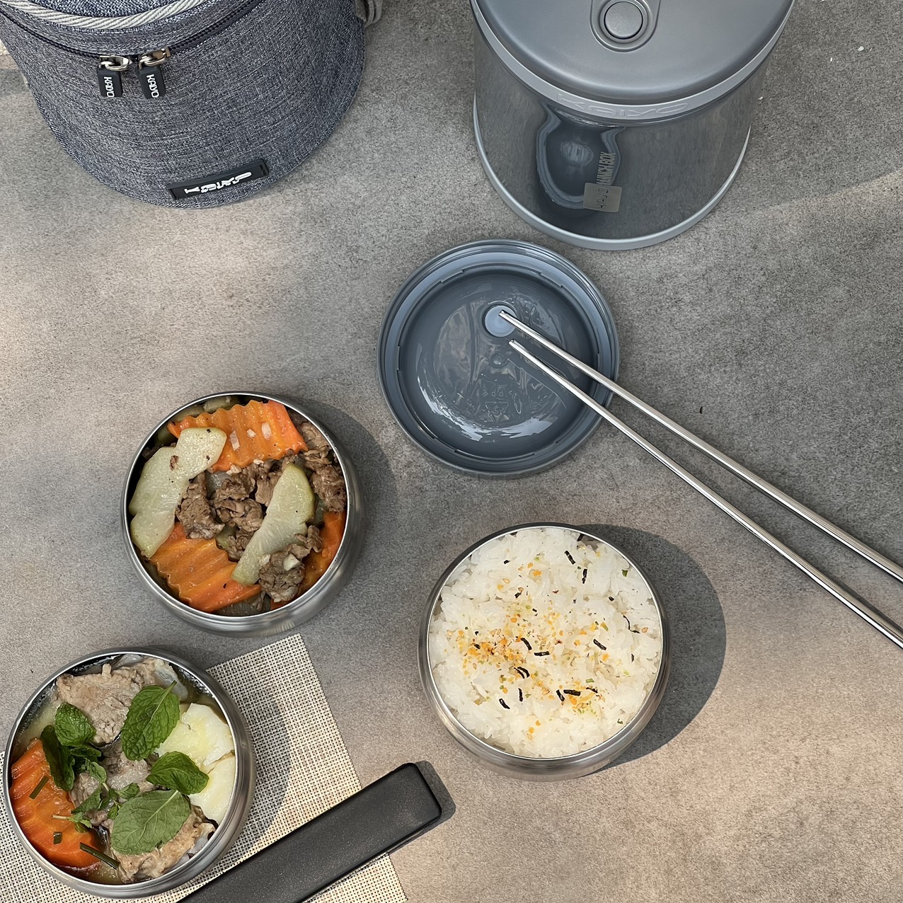- + Bộ gồm 1 hộp giữ nhiệt chân không 1700ml, 3 hộp đựng thực phẩm: 2 hộp 250ml và 1 hộp 450ml, 1 đôi đũa và 1 túi giữ nhiệt.