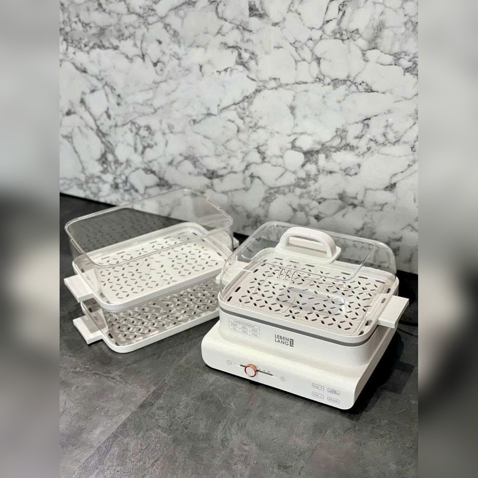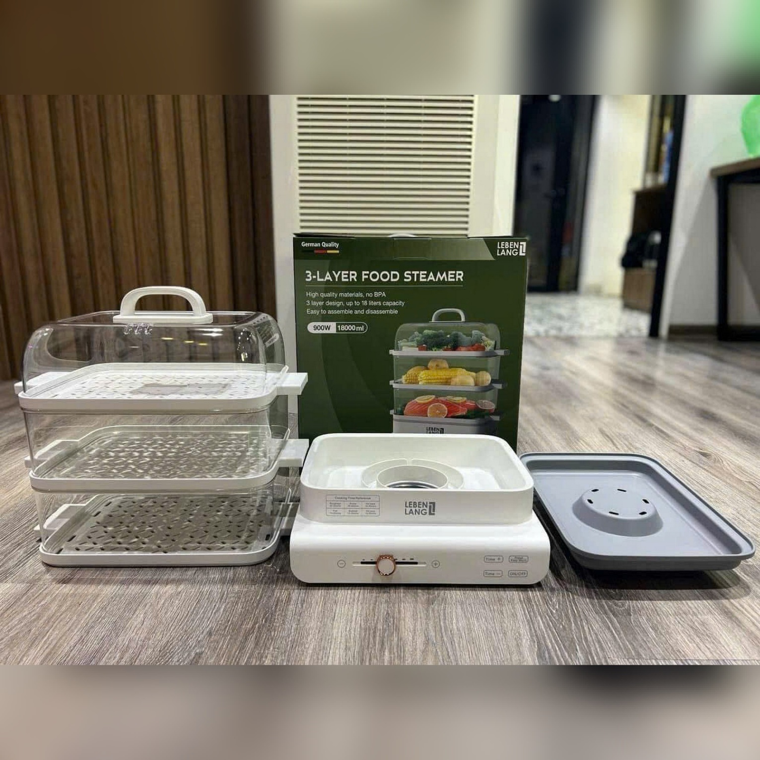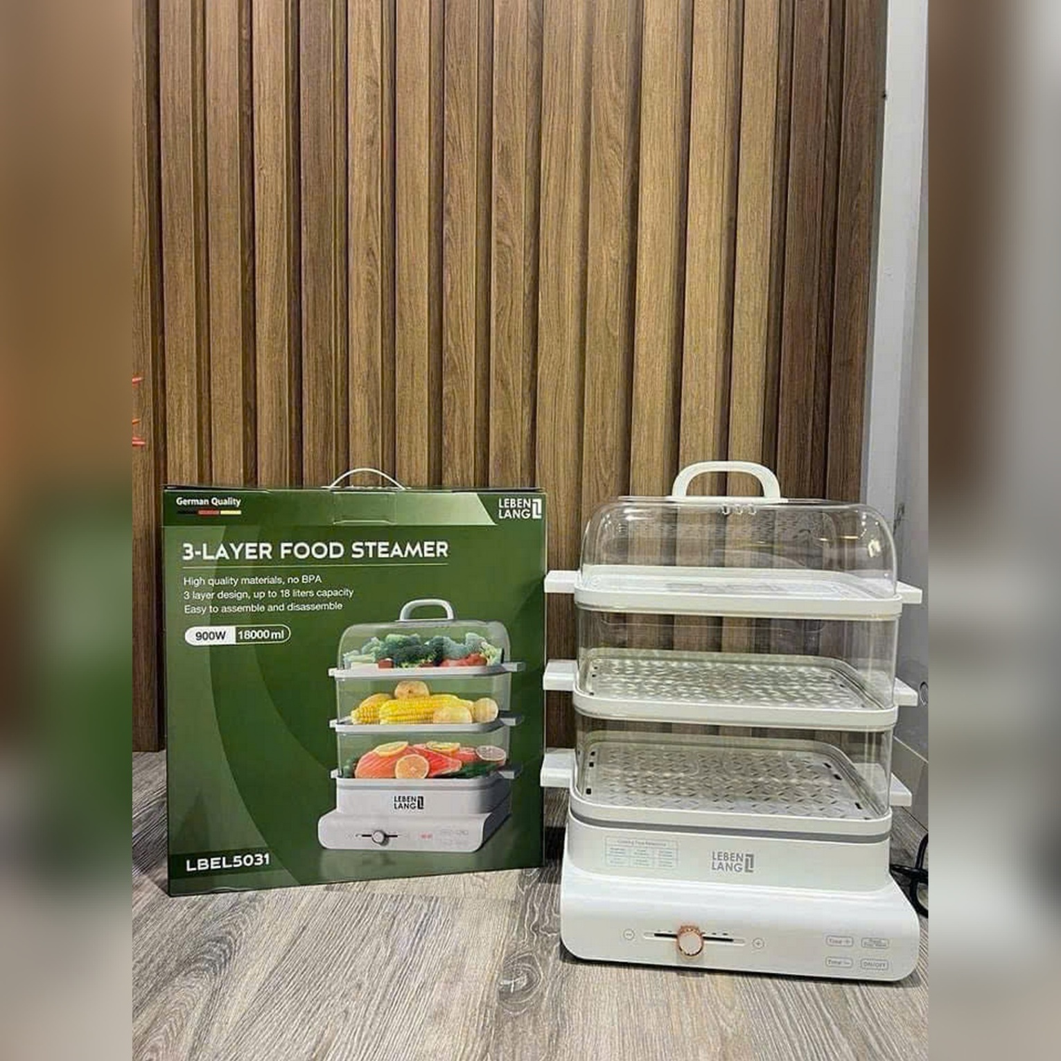 Thiết kế 3 tầng hấp linh hoạt (mỗi tầng 28 × 22 × 10 cm) cho phép bạn hấp rau, củ, hải sản, thịt cá cùng lúc mà không lẫn mùi