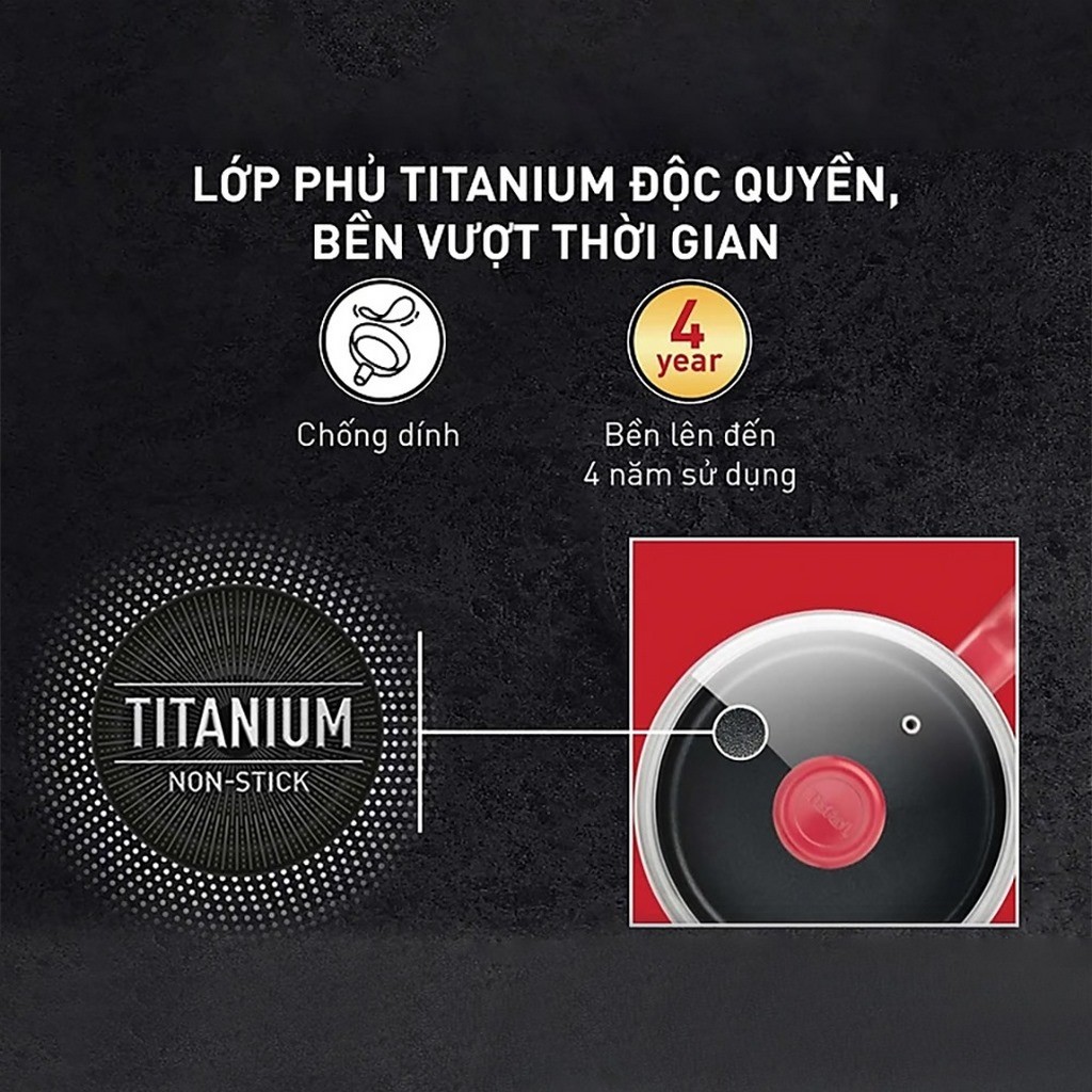 Lớp chống dính Titanium bên trong và ngoài, chịu được hơn 16 000 lần chà nhám, dễ làm sạch