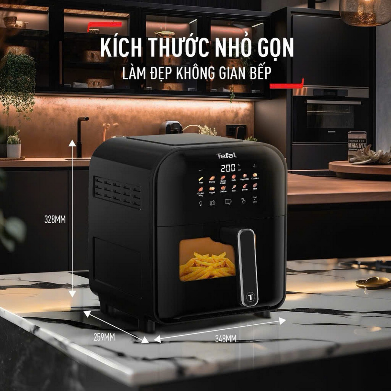 | Chương trình nấu | 12 chương trình nấu được cài đặt sẵn: khoai tây đông lạnh, khoai lang, đậu, rau củ quả, bánh ngọt, cánh gà, gà viên, gà nguyên con, hải sản, tôm, thịt |