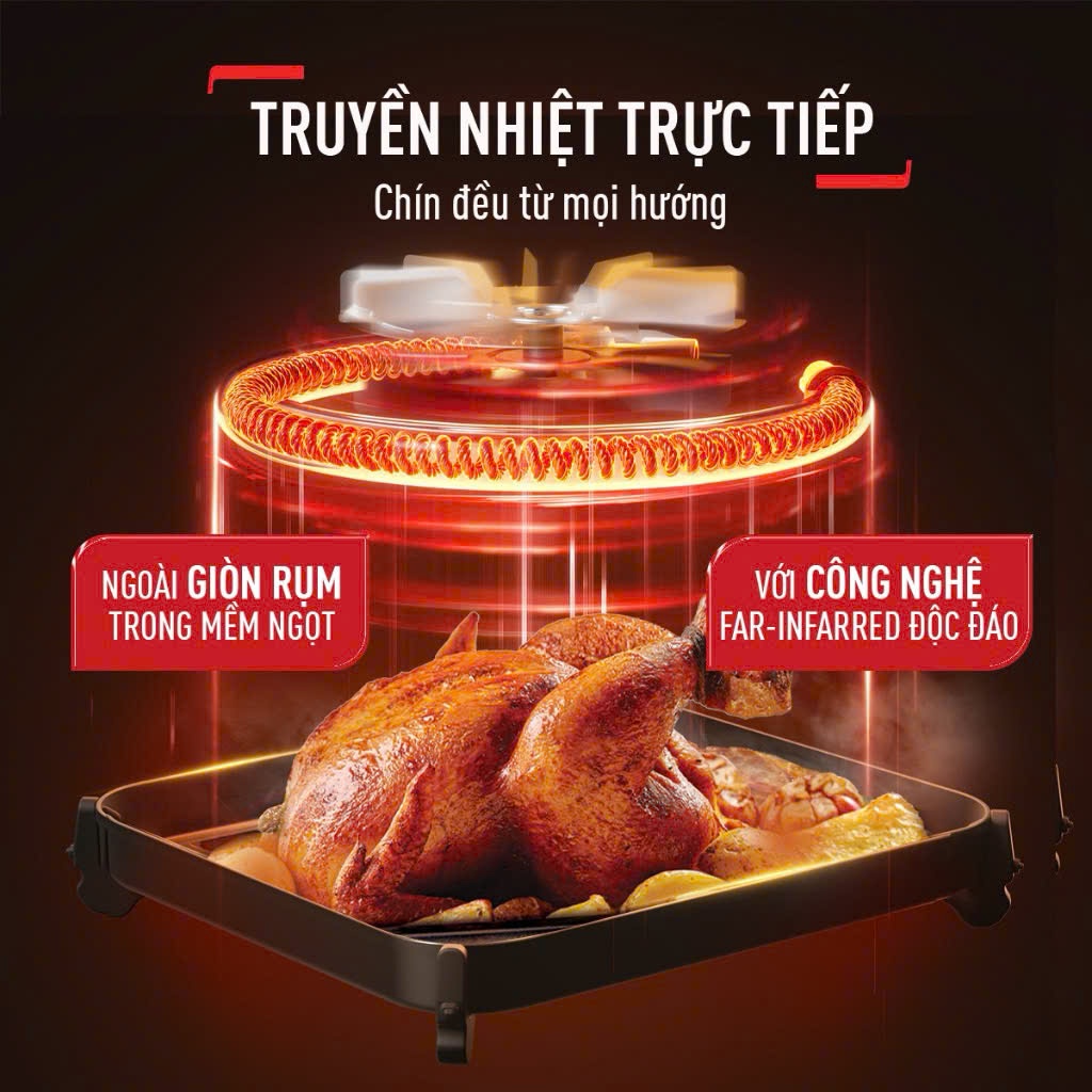 Công nghệ hồng ngoại (Far‑Infrared) kết hợp luồng khí nóng 360° giúp thức ăn chín đều, giữ giòn và mọng nước, không cần thời gian làm nóng trước