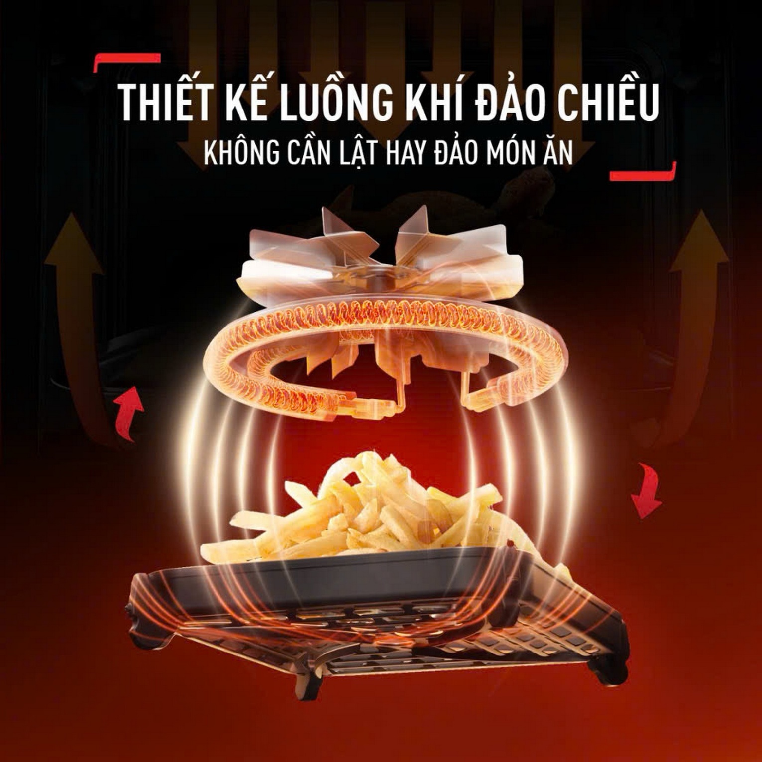 | Tiện ích | Giỏ chiên với thiết kế mới, đảm bảo không khí lưu thông theo nhiều hướng, không cần lật trở khi chiên |