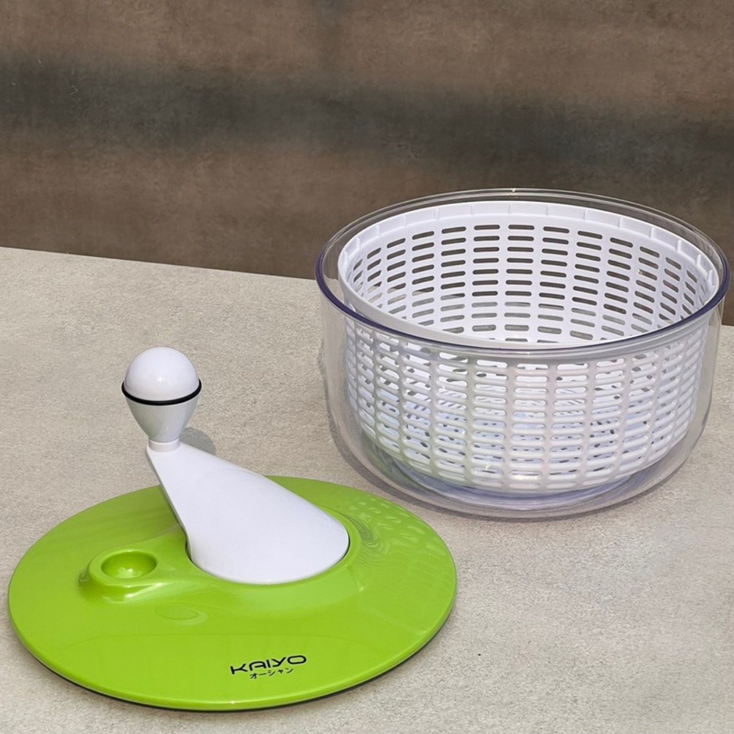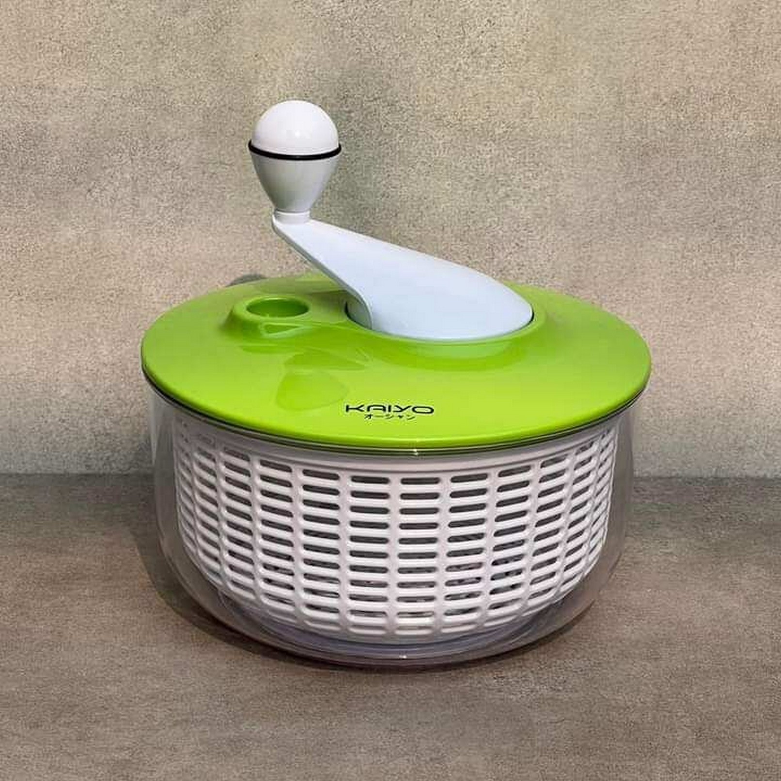 Rổ quay rau li tâm Kaiyo được làm từ dòng nhựa cao cấp (tô bên ngoài bằng nhựa thủy tinh PS trong suốt và chịu nhiệt cao, rổ bên trong bằng nhựa PP), đáy rổ có gioăng silicon chống trượt có ưu điểm vượt trội: lực xoay nhẹ, tốc độ xoay mạnh giúp quay li tâm làm kiệt nước thực phẩm và làm sạch hoa quả nhỏ, khó rửa như táo, nho …
