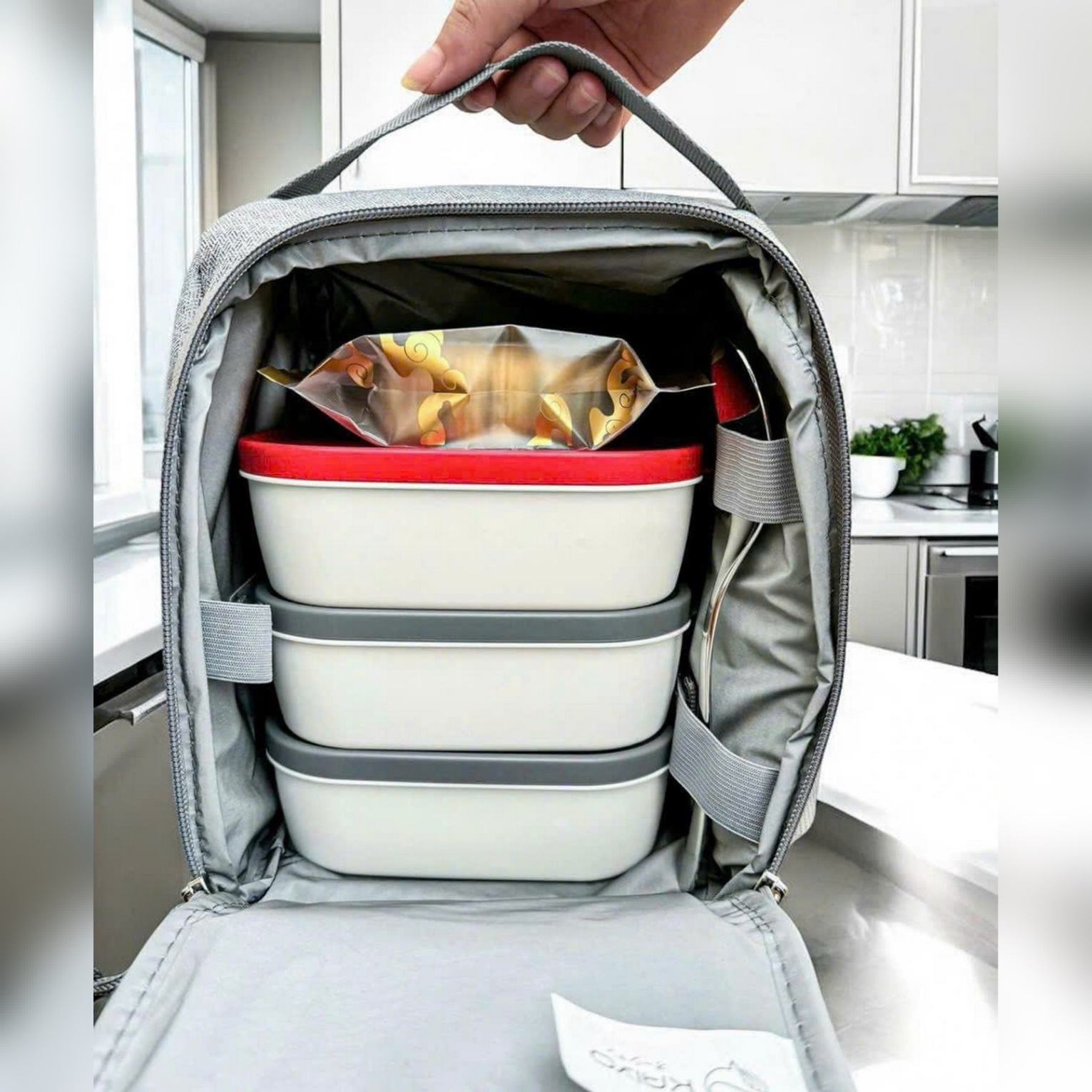 Thiết kế thông minh: 1 ngăn lớn, 1 ngăn phụ phía trước và 1 ngăn lưới bên hông — tiện phân loại hộp cơm, nước, thìa đũa