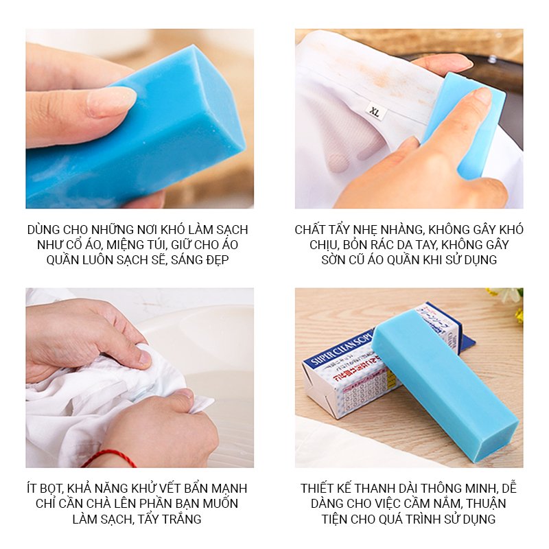 – HDSD: chỉ cần thấm ướt quần áo, chà nhẹ sản phẩm lên những chỗ có vết bẩn và ngâm, rồi giặt (giặt tay hay giặt máy đều được).
